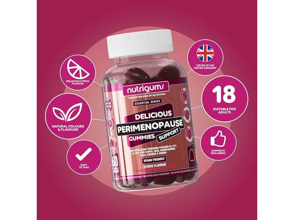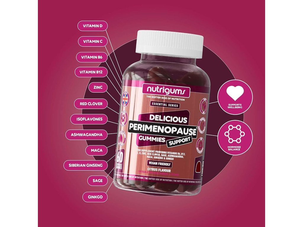 Složení: glukózový sirup, sacharóza, voda, želírující látka pektin, extrakt z květů jetele červeného (Trifolium pratense L.), kyselina L-askorbová (vitamín C), Maca (Lepidium meyenii) extrakt z kořene 5:1, extrakt z kořene Ashwagandhy (Withania somnifera), šalvěj lékařská (Salvia officinalis) extrakt z listů 2:1, sibiřský ženšen (Eleutherococcus senticosus) extrakt z kořene 10:1, regulátory kyselosti (kyselina citrónová, citrát sodný), citrát zinečnatý, přírodní aroma, barvivo (přírodní paprikový extrakt), kokosový olej, ginkgo (jinan; Ginkgo biloba) extrakt z listů, pyridoxin-hydrochlorid (vitamín B6), cholekalciferol (vegan vitamin D3), leštící látka karnaubský vosk, kyanokobalamin (vitamín B12).